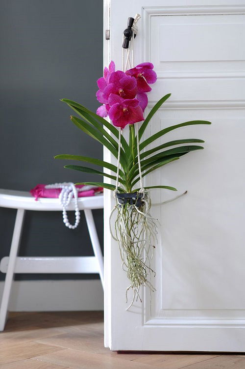 Here’s a great way to add foliage and flowers to boring corners. All you need are cute little hangers, a couple of command hooks, and, of course, pretty orchids.