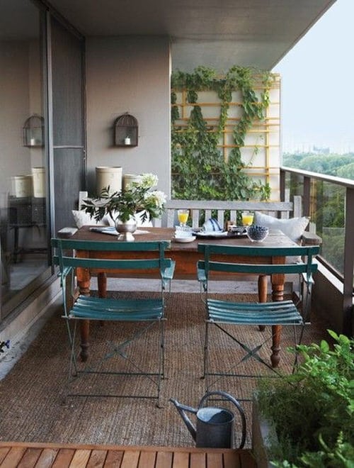 A small space outside your urban apartment can be used to keep wooden chairs and plants.
