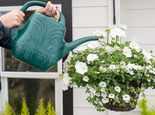 Hanging baskets are often difficult to water because they may be placed at a height that is inconvenient to reach regularly. Simplify your work by using a watering can with a long spout that can directly reach the soil and roots without dampening the foliage. This also helps reduce water wastage, and some cans look quite aesthetic!
